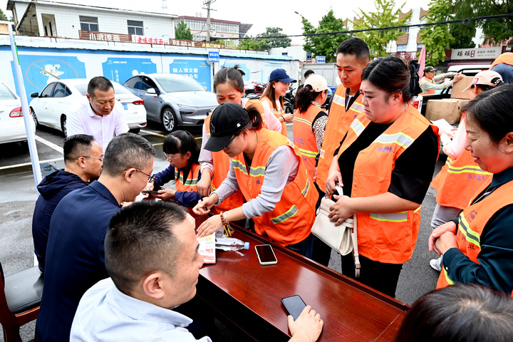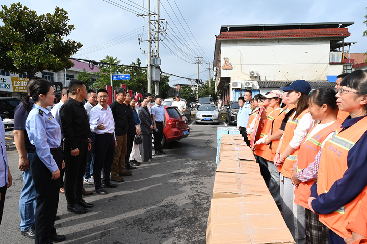 活动首先进行的是慰问环节,这一环节也成为海州区市场监管局“食药安邻里”惠民服务的生动实践阵地。海州区市场监督管理局工作人员不仅将经过整理抽检合格的米、面、食用油等民生类备份样品物资,逐一送到20位环卫工人手中,还现场搭建起“食药安科普小课堂”,用通俗易懂的语言讲解食品安全常识——从如何辨别过期食品、查看食品检验合格标识,到日常食材的储存保鲜技巧,手把手帮助环卫工人提升食安防范意识。这些物资虽不厚重,却既是对环卫工人辛勤付出的认可与感谢,更是“食药安邻里”服务贴近基层的具体体现。一位环卫工人接过物资后感动地表示:“不仅拿到了实用的东西,还学会了怎么看食品合格不合格,太贴心了,我们会继续做好本职工作,让花果山街道的环境更整洁。”随后,花果山街道的城管队员们也收到了这份包含食安关怀的慰问物资,让他们切实感受到来自社会与职能部门的双重关爱。