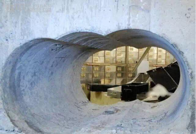 透过这个拱形的洞,被丢弃的保险箱、包括角磨机、混凝土钻这样的电动工具,还有撬棍都一目了然。