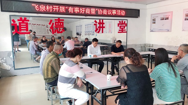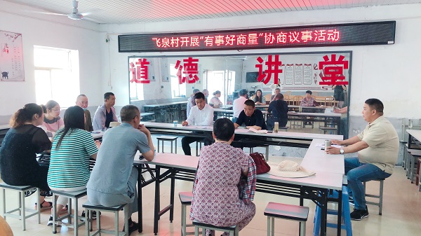 蔡卫民委员表示飞泉村有事好商量协商议事室的建立是更好的让村民之间的事情能得到充分的沟通,协商议事室可以不拘形式,可以在田间地头,可以在村民家中,让大家一起坐下来,有事好商量,有事多商量,并从不同角度、不同层面充分给出了意见和建议。大家纷纷表示赞同,为村里更好地完善村规民约提供了重要帮助。